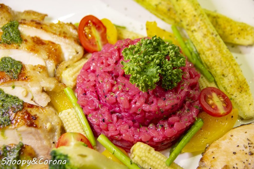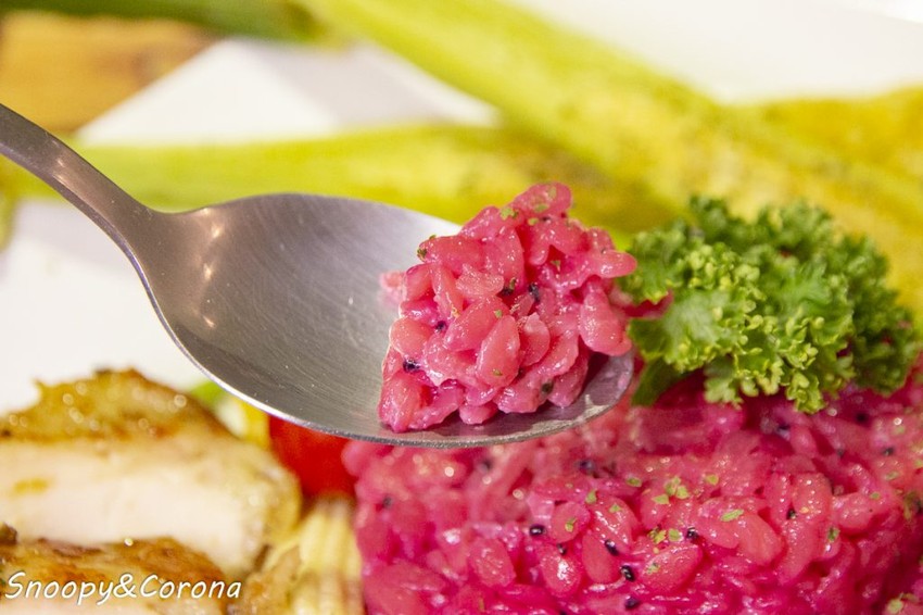 桃紅色的米飯是以火龍果果汁染色的米型麵,這個顏色好少女好夢幻。❤