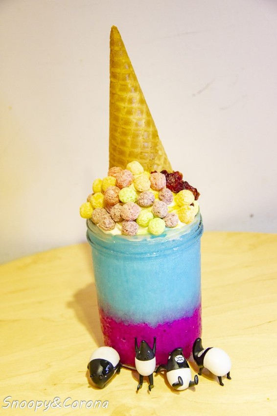 紫紅色則是來自火龍果。冰沙上還加了彩色圓球玉米脆片,