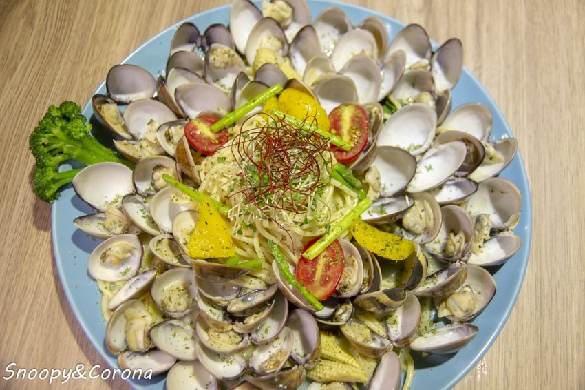 蛤蜊多到數不清而且擺盤如同盛開的花朵,簇擁著像是蕊心的義大利麵,