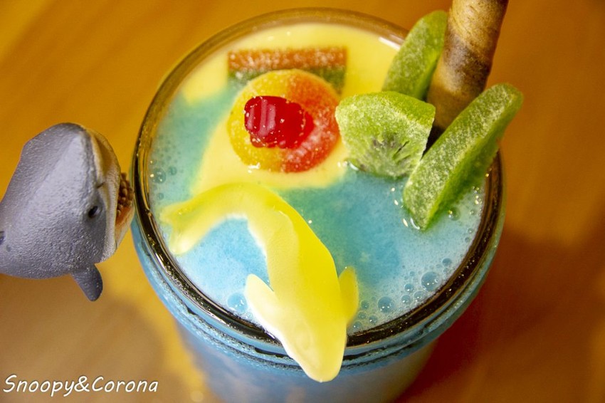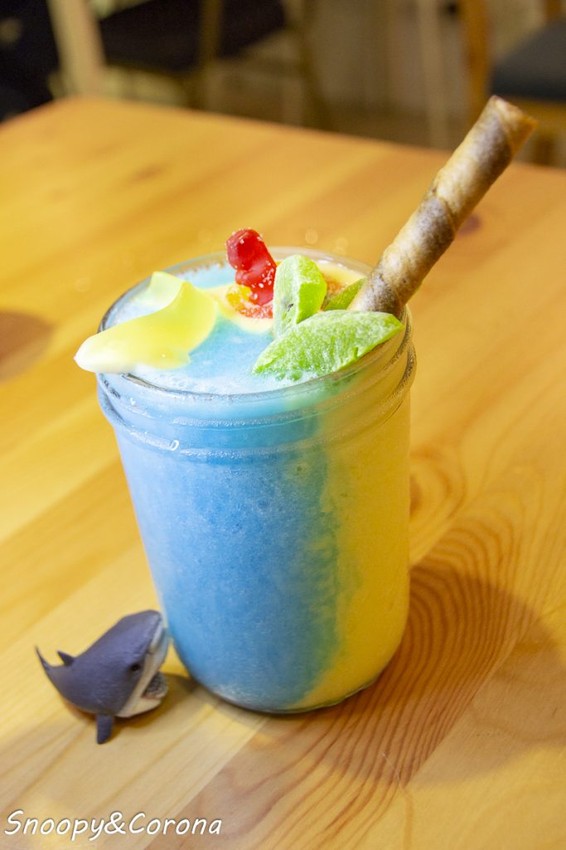 冰沙上飄浮著綠色椰子樹、小熊與鯊魚造型的軟糖,