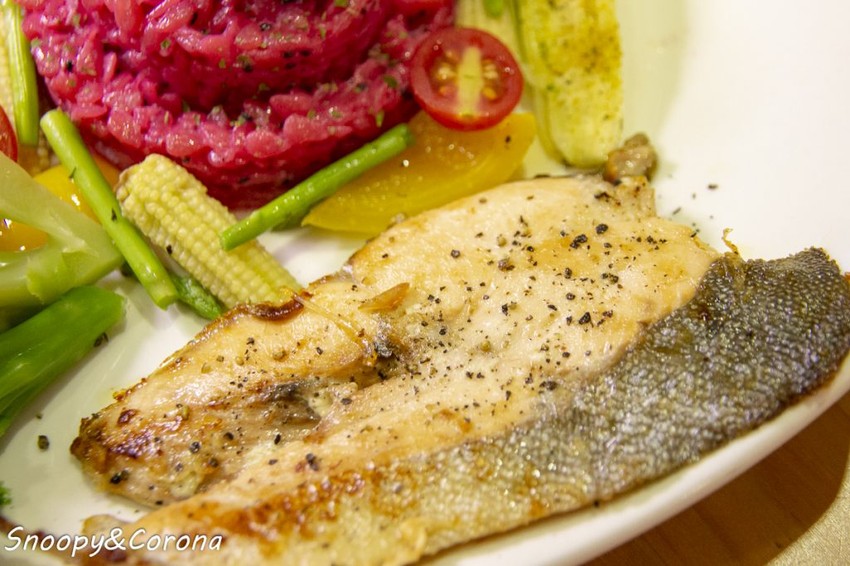 鮭魚排有鎖住油脂與水份,搭著黑胡椒的椒香入口滋味誘人