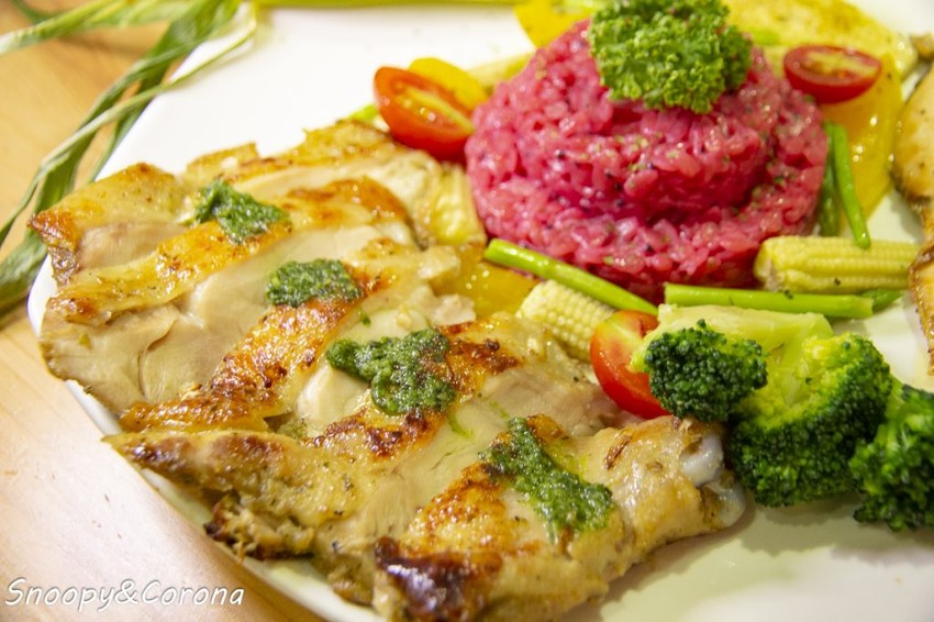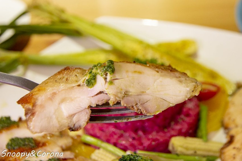 採用去骨雞腿外皮煎得酥香、肉質則是軟嫩多汁帶有羅勒的香氣