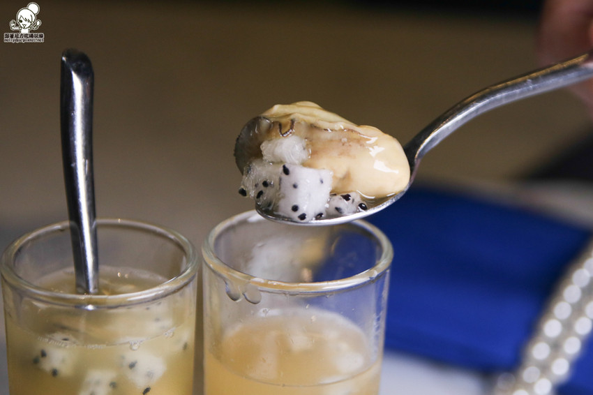 裡面有新鮮川燙過的鮮蚵,還有水果香氣顆粒的果醋