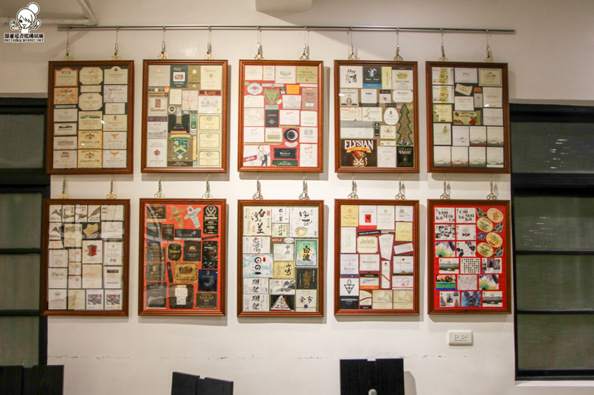 牆壁上有各式各樣的酒標籤,讓酒標籤也變成一幅幅美麗畫作