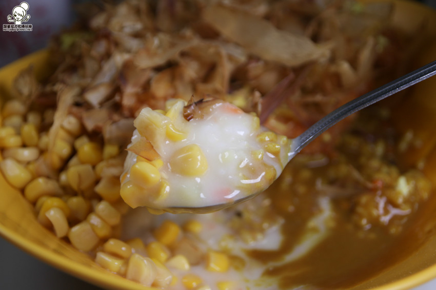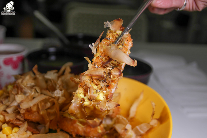 豬排一樣帶有酥脆口感,還有柴魚片的香氣上面還有撒上香鬆與黃芥末醬,讓香氣整個在嘴裡交疊,還不錯ㄟ~越吃越好吃