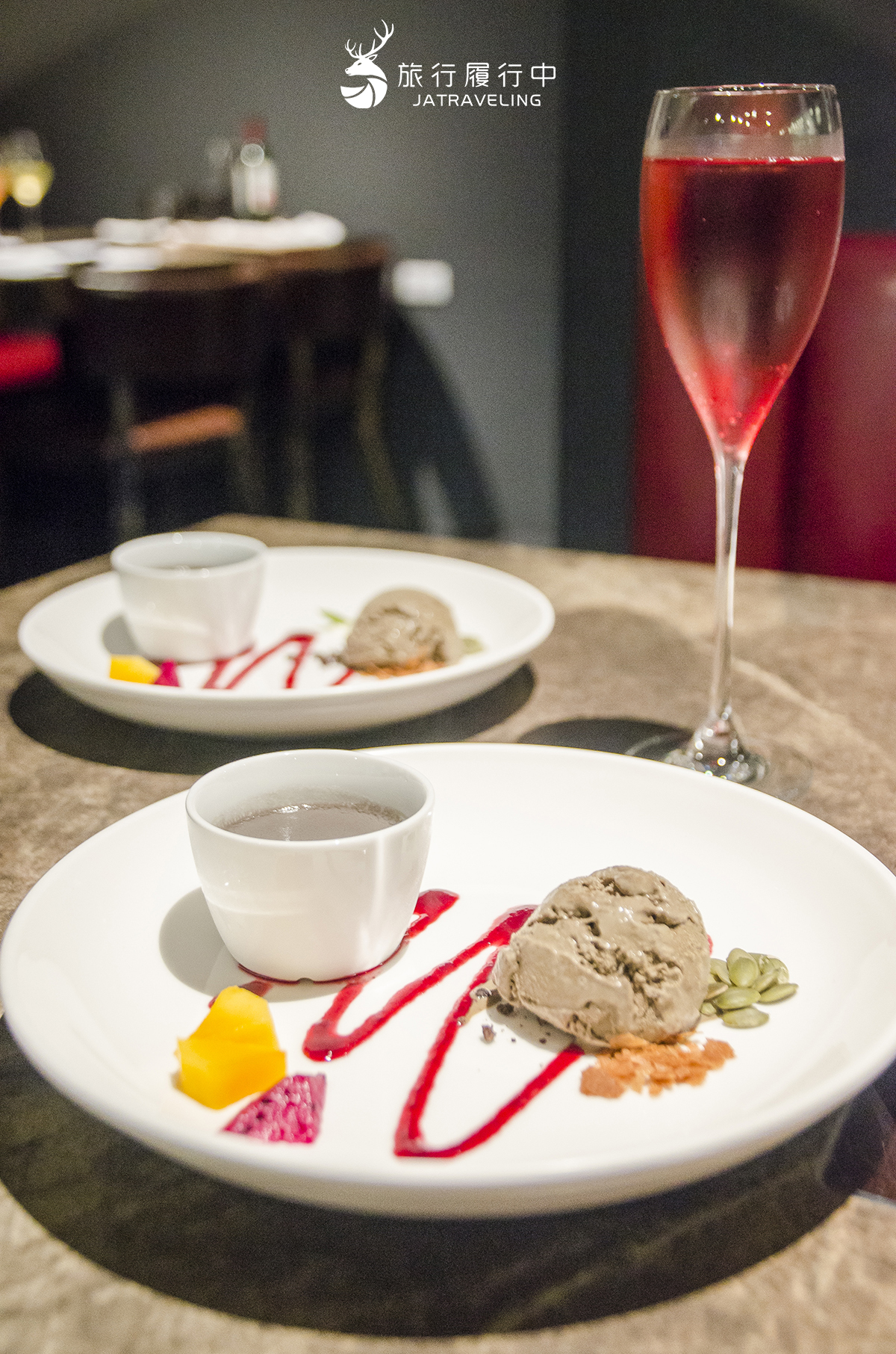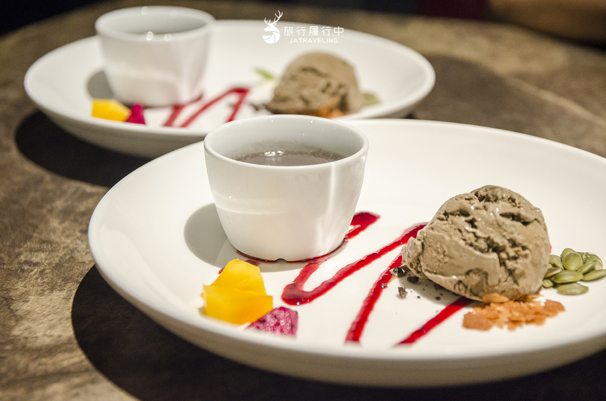 飯後則有藍柑橘佐百香果冰沙解膩,最後的甜點則芝麻布丁、季節水果,以及比較特別的鐵觀音冰淇淋,帶著鐵觀音本身的苦香吃起來很爽口,旁邊則有莓果醬、葵花籽、脆片可自行搭配,相當用心。