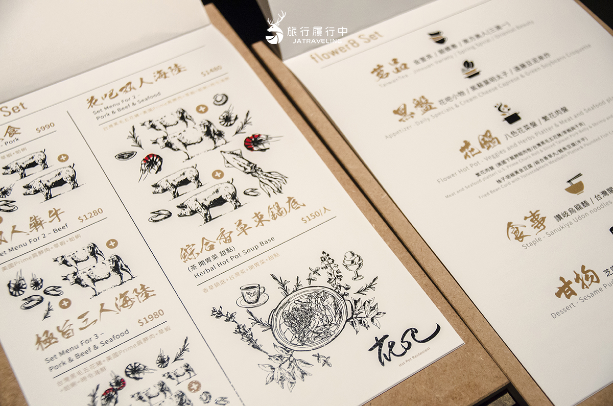 └ 白色為菜單,黑色為酒單點餐方式依照人數、肉品而有不同套餐選擇,像是雙人豬肉、雙人牛肉、雙人海陸、三人海陸等,另外食量小或素食者則可以單點鍋底,另外再加點鍋料等。我們這次則品嘗$1480的雙人海陸套餐。