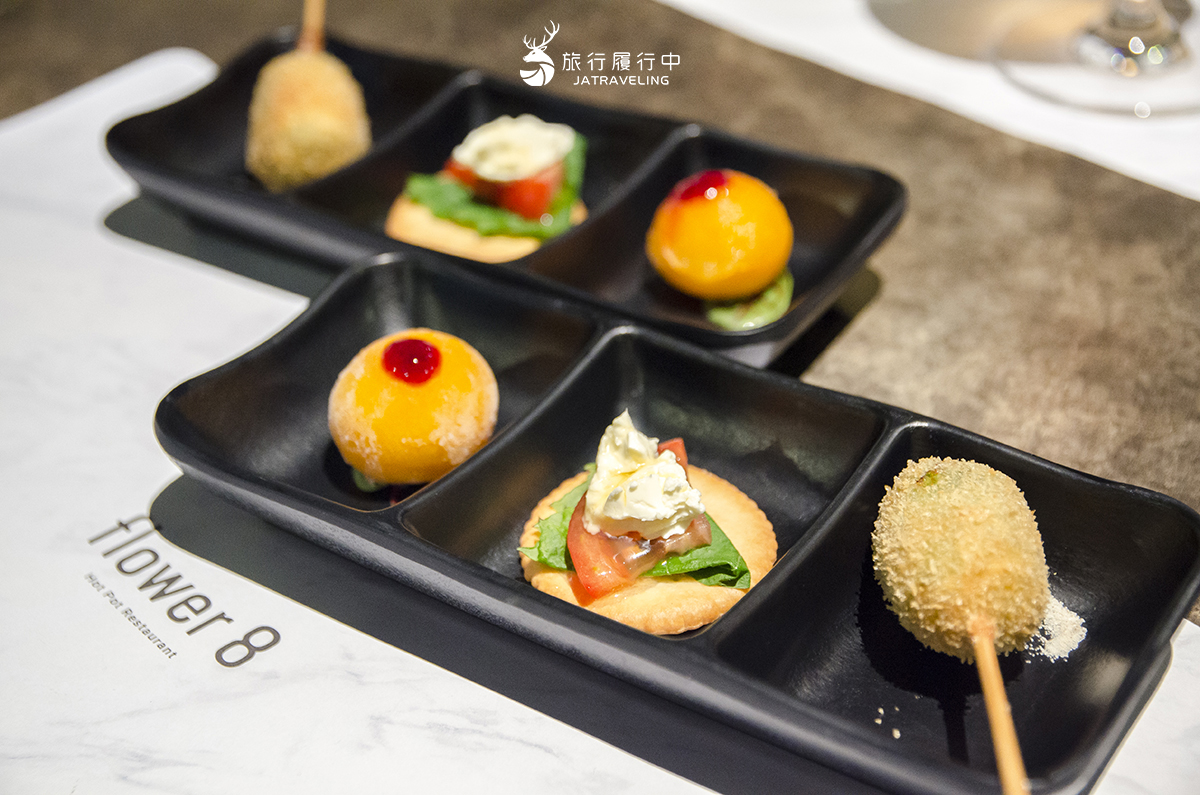 台中大多火鍋店都以高單價的肉品做為主打,Flower8雖然同樣把關肉品水準,但在小菜、菜盤上花了更多巧思,以八色花菜盤而言,有訂製的三色丸子,分別是墨魚、泡菜、麻婆豆腐口味,很難相信麻婆豆腐竟然可以做成丸子,還有鱈魚豆腐、柚子胡椒黃金豆腐,這幾項都非常推薦好吃。