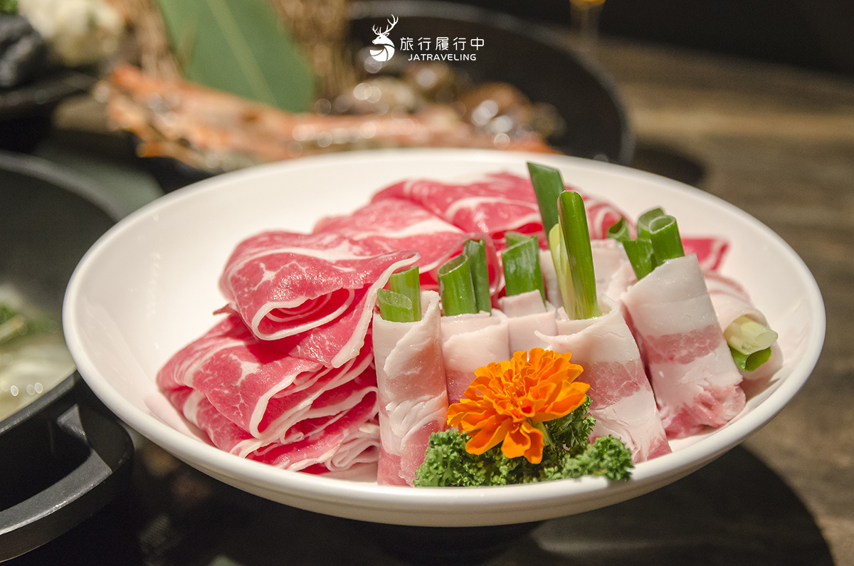 繁花肉盤則有美國Prime的肩胛牛肉以及台灣黑毛五花豬,肉品的分量相當多,特別的是豬肉包裹的蔥段一起,吃起來更加有層次。