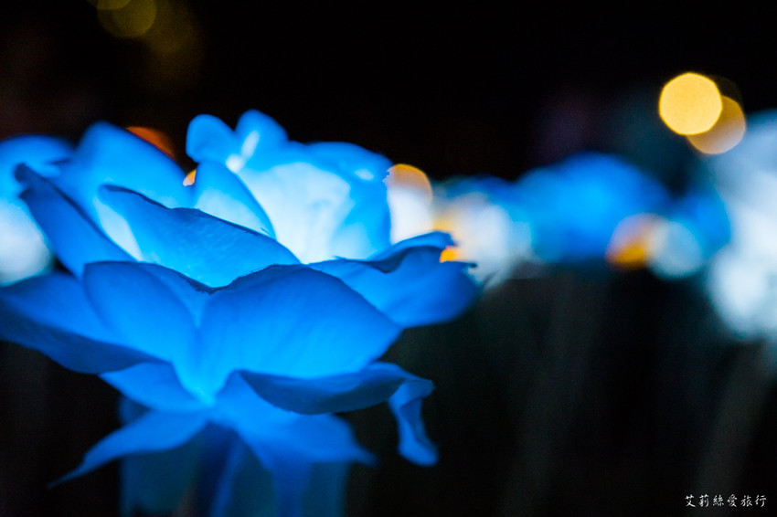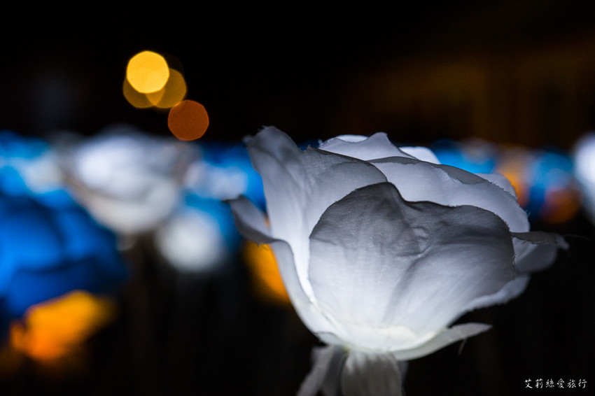 玫瑰燈飾花海由白、藍、黃三色組成,燈飾展區說實在並不大,花朵會隨風飄曳,拍起來還蠻唯美的