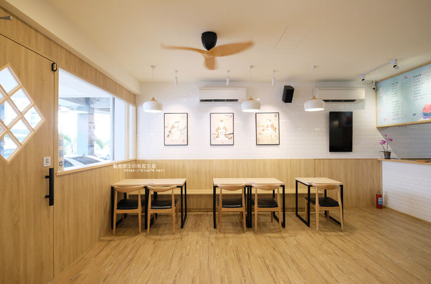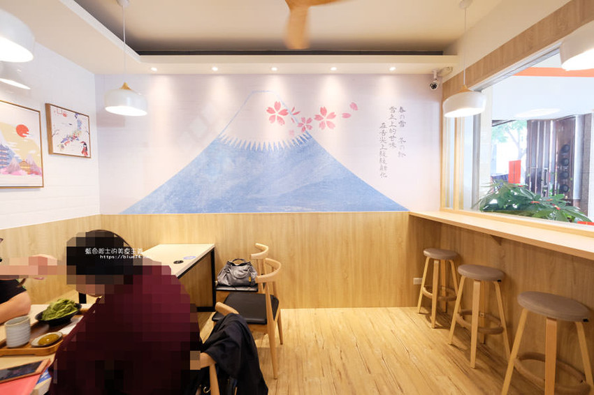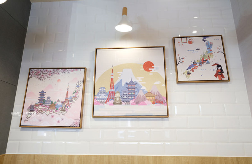 裡面木質調搭配白色磁磚,牆上掛著日系設計圖案