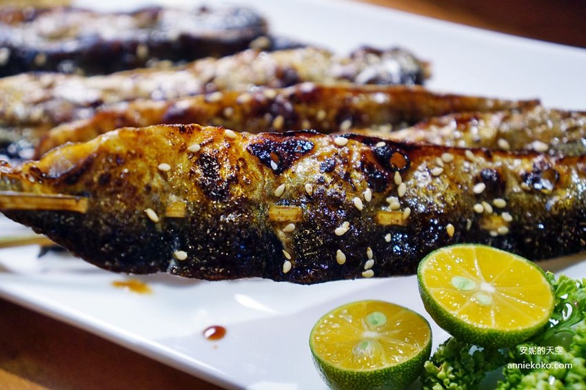 秋刀魚串燒CP值也太高了,灑上芝麻的秋刀魚烤得很酥,最貼心的是惱人魚骨已經去掉,只剩下鮮甜以及香酥的魚肉,我超喜歡表面的魚皮部份,帶點微甜的醬汁烤過後,魚肉鹹香又帶點微甜口感,加點桔子汁會更增添風味,帶有果香更好吃。
