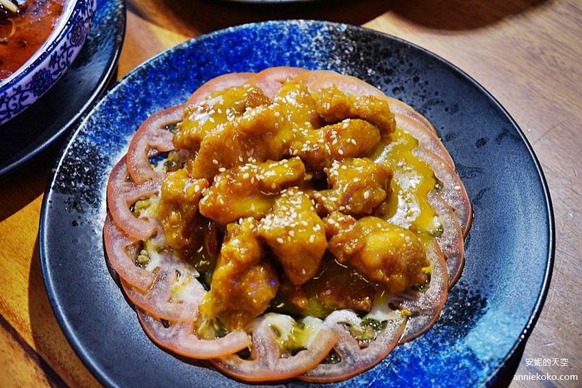 豬肉片包裹著番茄片,這搭配我還是第一回吃到,番茄的果香完全融入豬肉片裡,充滿果香的豬肉片嫩口多汁,平衡了肉的鹹味,多了清爽果香。