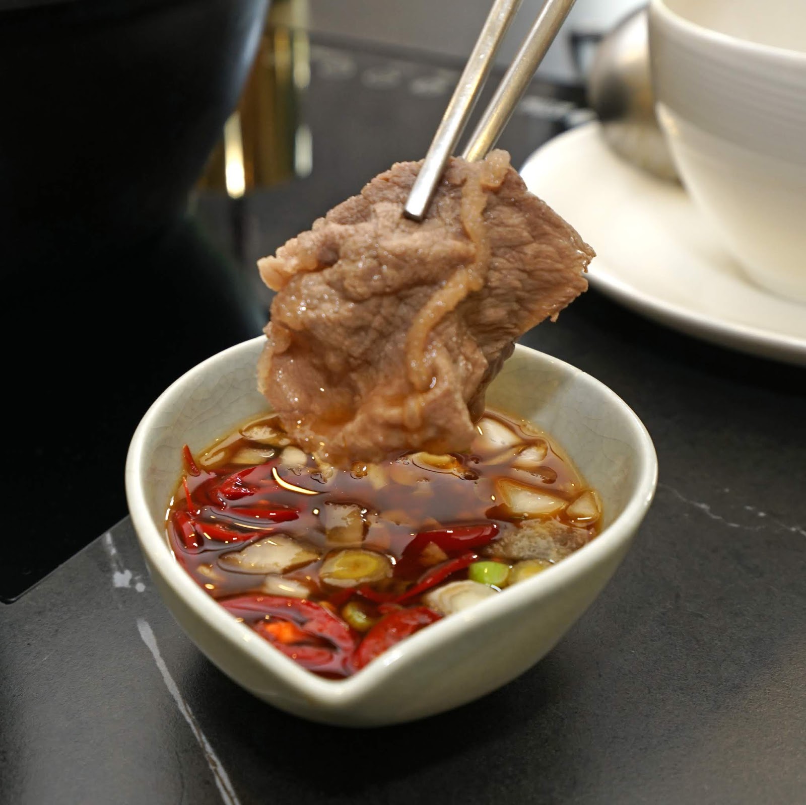 以瘦肉為主的牛肉片厚薄度切得適恰,輕涮幾下入口,口感很軟嫩,肉汁飽滿與日式沾醬的醋味在嘴裡調和成曼妙的好滋味。