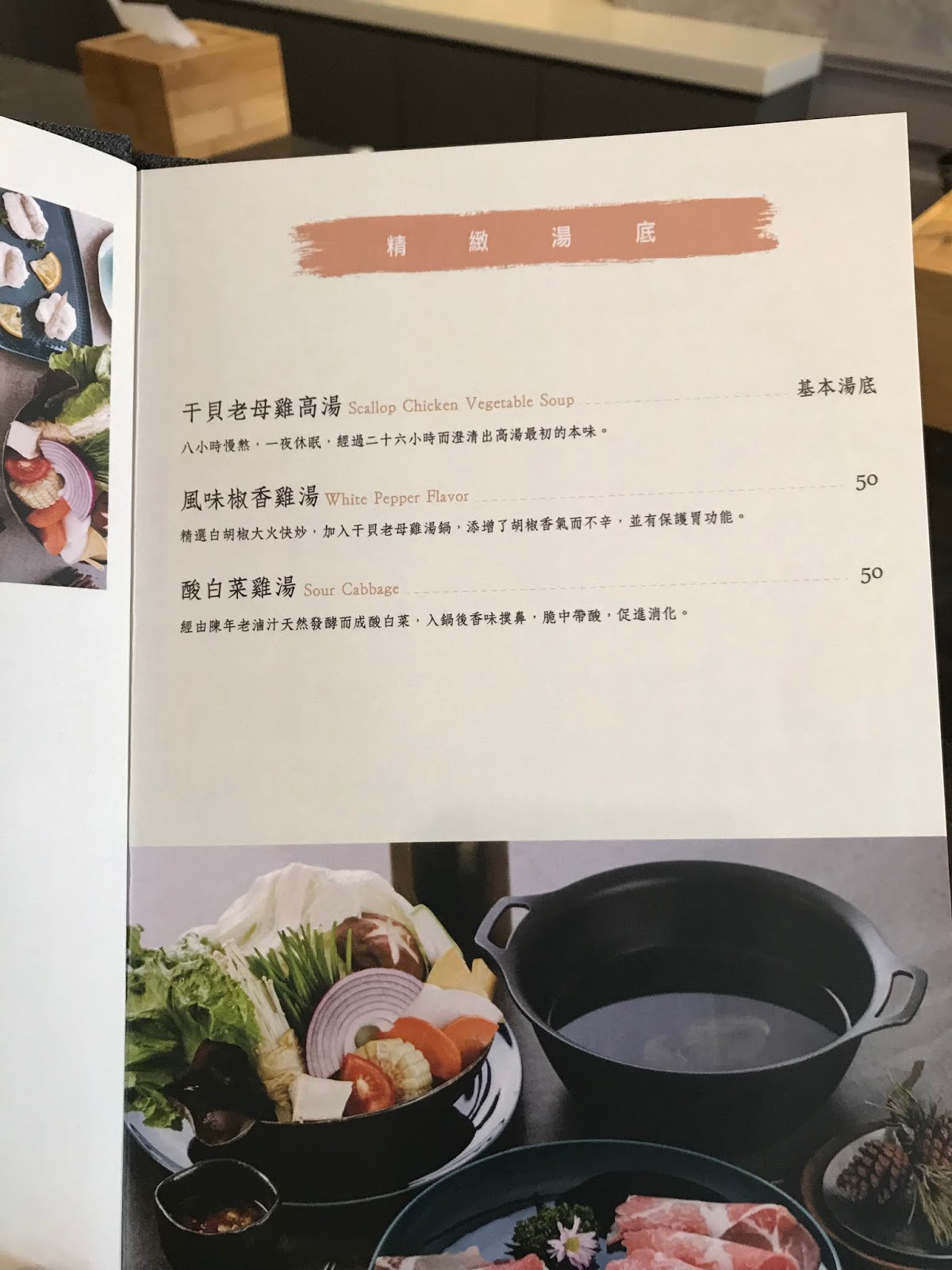 確認餐點後會先端上干貝老母雞湯與冰涼微甜的冬瓜茶,在等待食材上桌前可以先喝茶,一邊等候湯汁滾沸。
