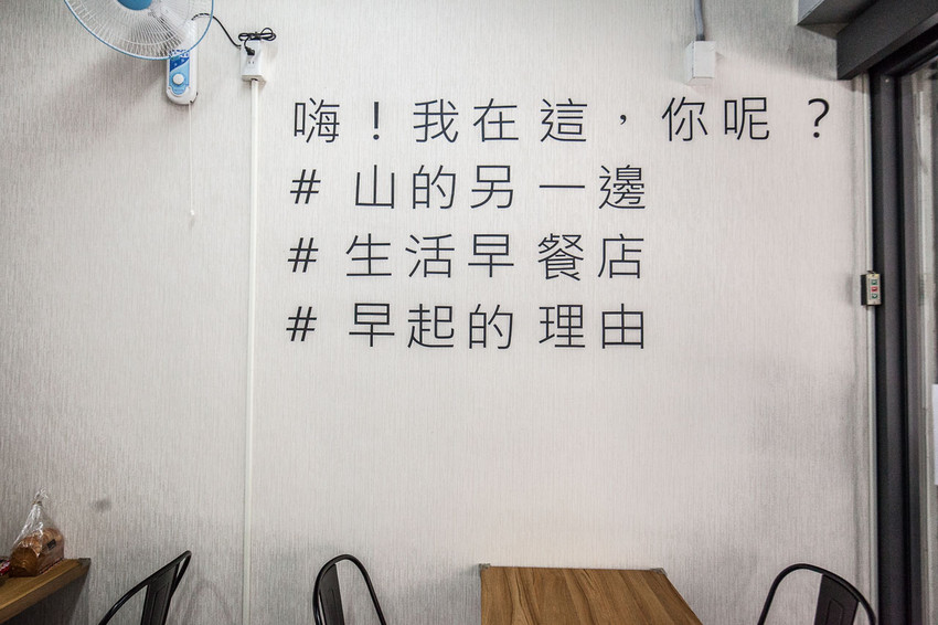 山的另一邊的命名還蠻有趣的,如果從台北市過來,走信義快速道路,確實是在山的另一邊,附近就是政治大學、動物園、貓空,吃完早餐還可以去附近溜達溜達,山的另一邊的店面還蠻簡樸的,白色裝潢簡潔乾淨,騎樓的箸子上還畫上可愛的標語跟圖片