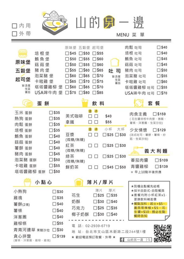 山的另一邊的菜單,比起一般早餐店雖然餐點品項沒那麼多,但是可以說是道道皆精選,光是漢堡老闆就自己做三種口味來搭配,土司也是不假他人之手通通自個兒來,餐點都是現點現做,不耐久候的朋友建議可以先打電話去訂餐唷