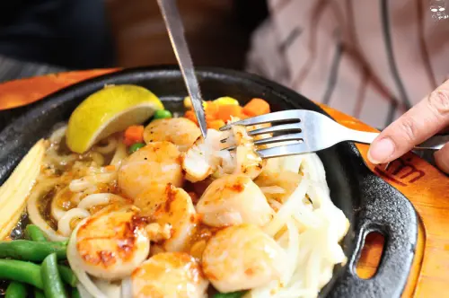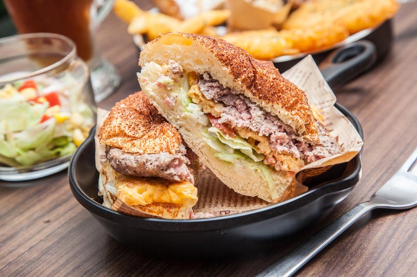 層層堆疊的各式好料,高到一口沒辦法塞下所有的配料,可以稍微壓一下或是切開比較方便實用,同樣也是用小鐵鍋裝,看起來超澎派的!