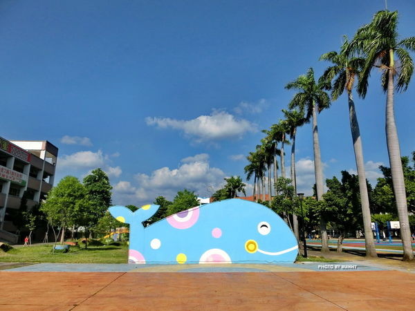 一進入校門就能見到藍色鯨魚,