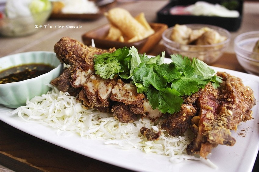 外衣炸得酥脆的雞腿搭配椒麻醬汁味道很棒,