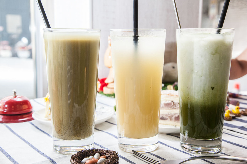 咬咬跟友人點了三杯飲料:水蜜桃多多、客家擂茶、抹茶歐蕾