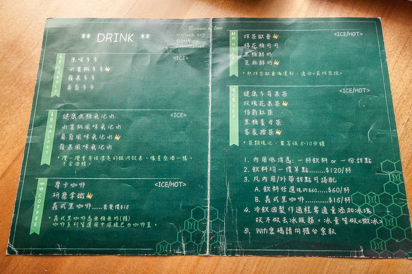 門口的小白板寫著營業時間跟用餐資訊,不限用餐時間跟無限wifi也太佛心了吧!義式黑咖啡搭配甜點只要15元!只是營業時間只有4個小時…,聽說通常不用4個小時店內的甜點就被一掃而空