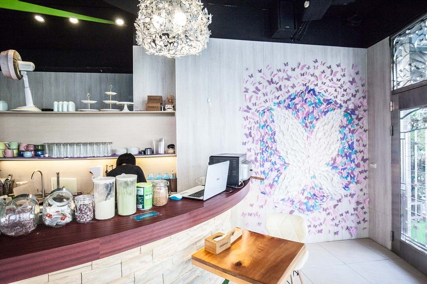 走入MOFA魔法氛子,因為MOFA魔法氛子位在轉角處,且店面設計是圓弧形的,MOFA魔法氛子索性利用這點優勢,利用大面的落地玻璃窗,營造出環景的景觀效果,也引進自然的天光,讓整體用餐氛圍十分輕鬆舒適,入口處還有一個蝴蝶牆,站在裡面就好像被蝴蝶包圍一般呢