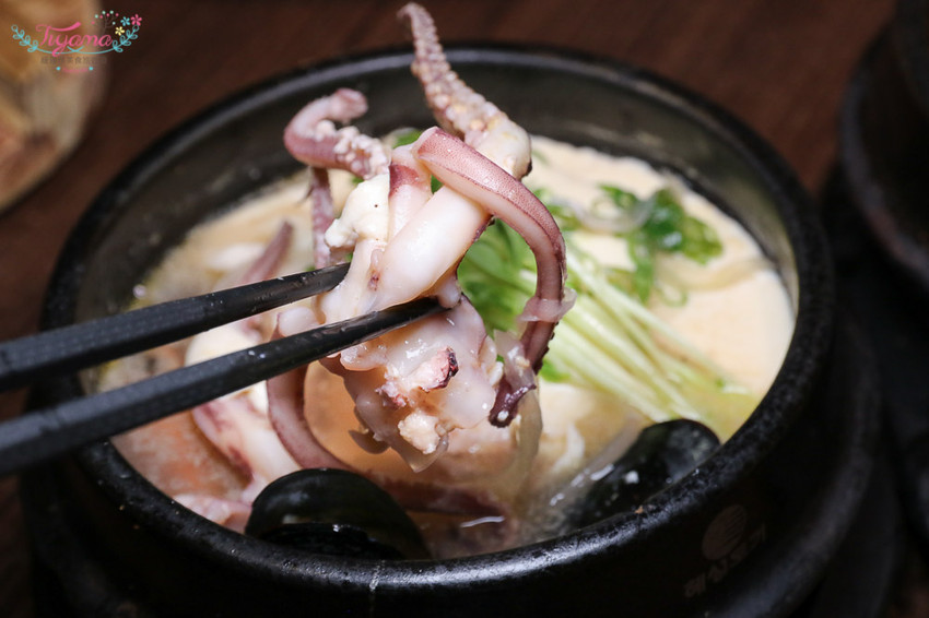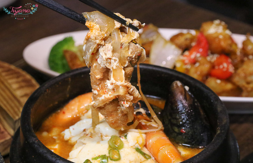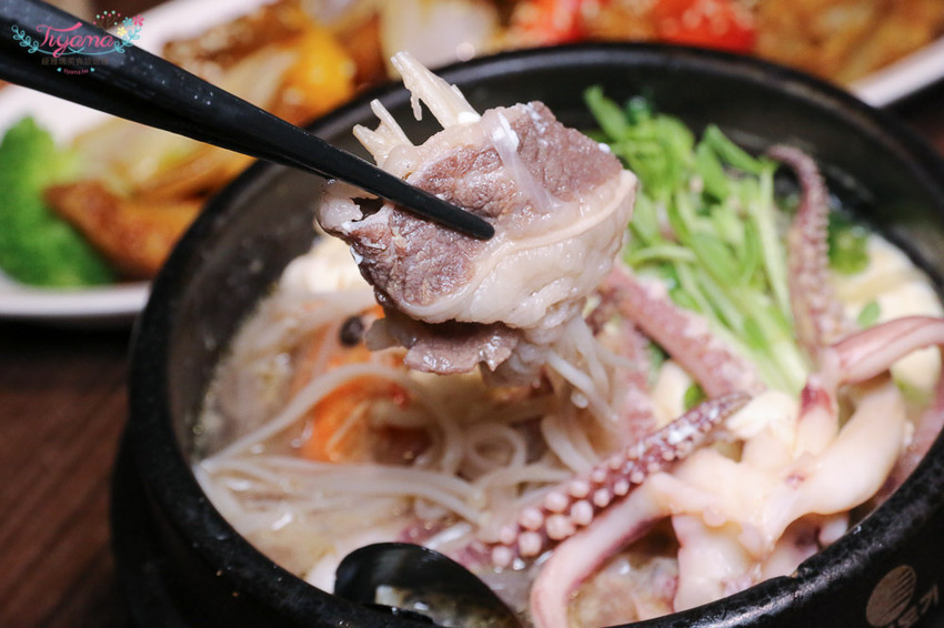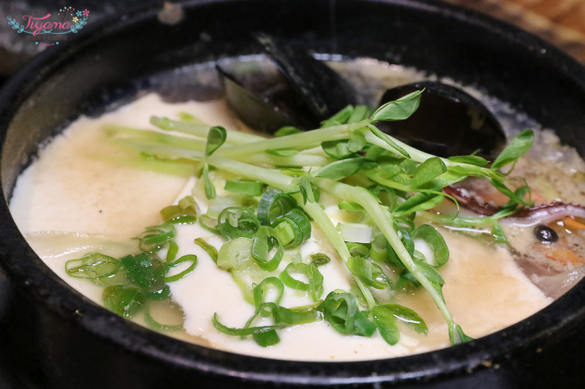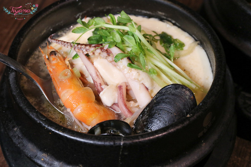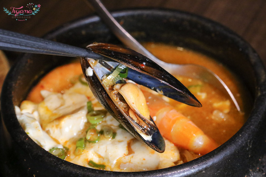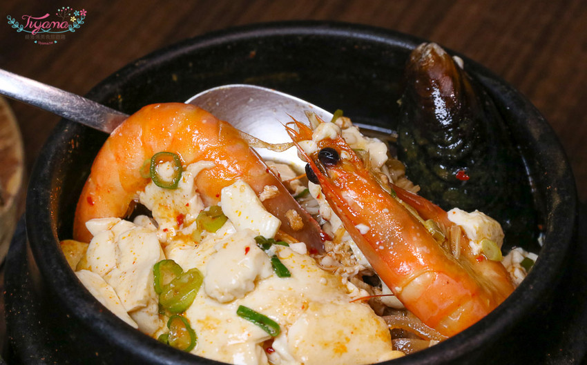 「海陸綜合豬肉豆腐煲」有手工豆腐、淡菜、白蝦、中卷、鮮蚵、豬肉片,小辣的韓式湯頭,微微麻~微微辣~喝起來很舒服。