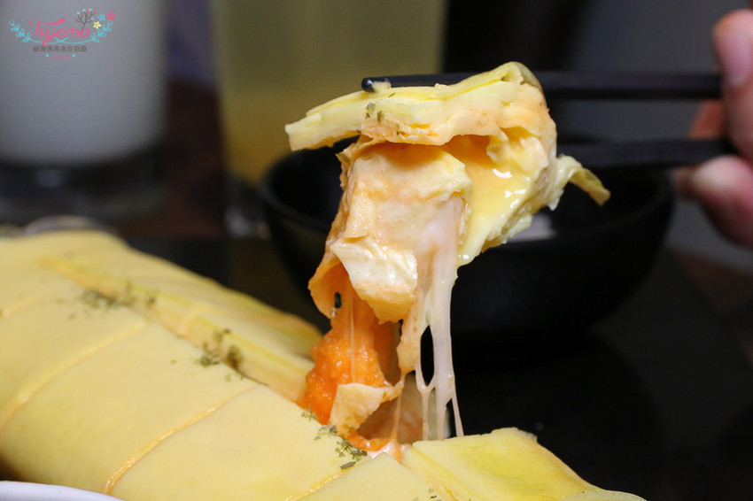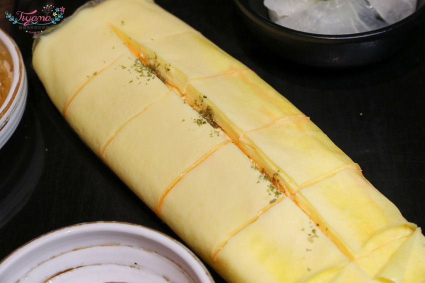 主廚巧手把「明太子起司烘蛋捲」外皮煎到光滑細緻,連切開的刀功都讓人無可挑剔~