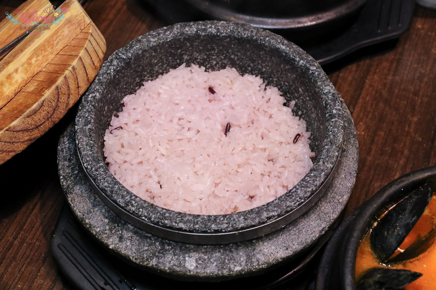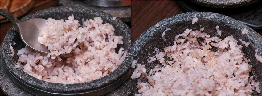 從韓國進口的角閃石鍋,現點現作,想吃香Q軟的米飯就要馬上開鍋拌炒一下,若是想吃帶點鍋粑飯的口感,就等一會再作拌炒。