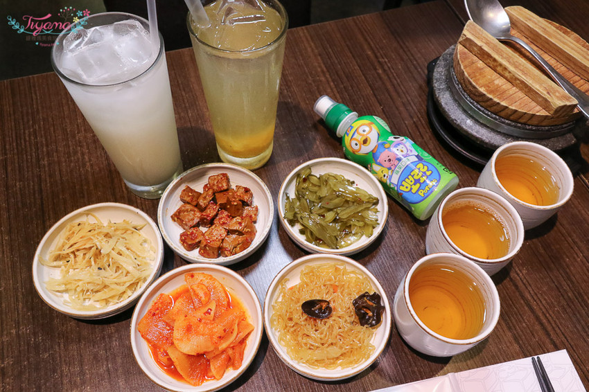 先上桌的是飲料和吃完可以續加的5樣精緻小菜,豆干、牛蒡絲、韓式辣蘿蔔、韓式冬粉、涼拌裙帶梗。