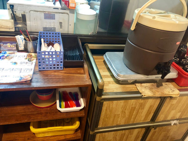 餐具和茶飲可以自行取用,小小店面,但是裡面座位很多,來的時候是用餐時間還小等一下,