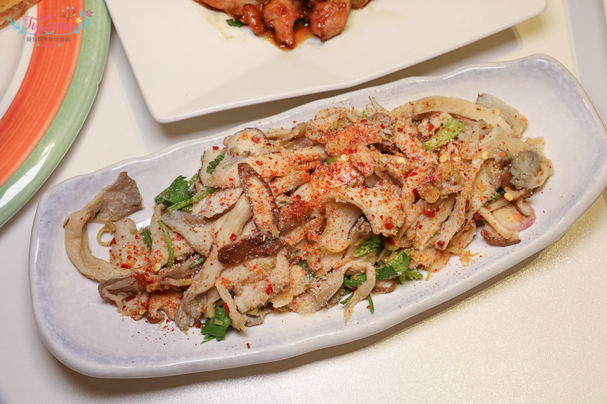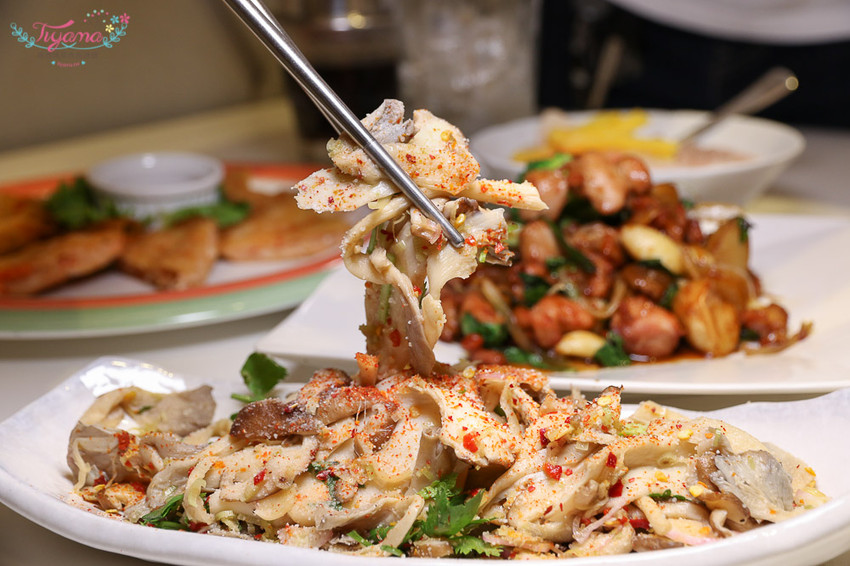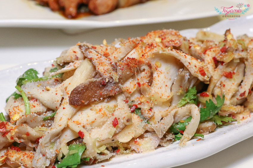 「依善野菇沙拉」微微的辣度,辣得很舒服!!選用2種菇類(杏鮑菇+秀珍菇)作涼拌,加入泰式調味,少許自然檸檬酸,酸鹹酸鹹再加上少許微辣口感很清爽。