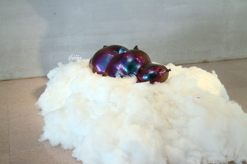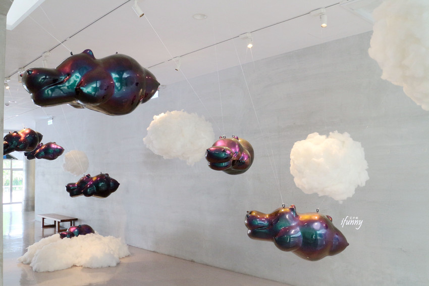 以FRP材質擬仿充氣型的軟雕塑,原先是體型笨重的河馬,卻輕盈地飛在半空中,嘴角微笑的模樣真是討喜。