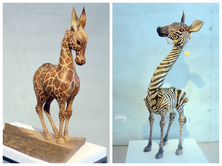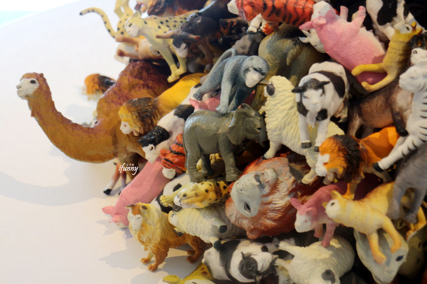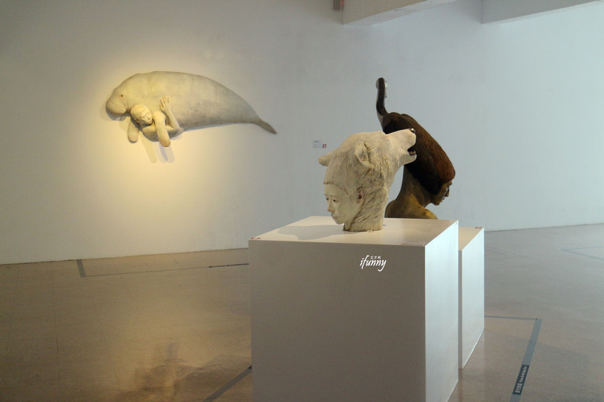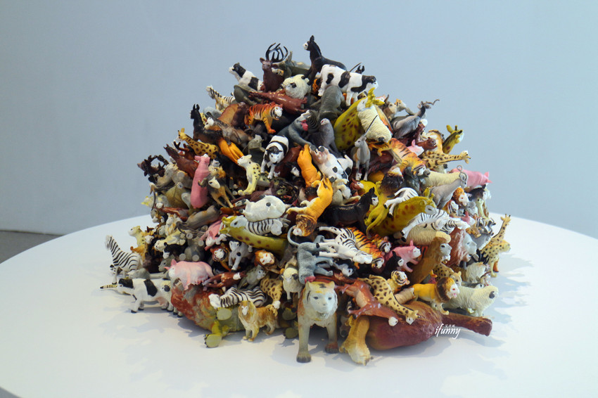 藝術家將玩具動物的臉雕刻成人面,似乎在諷刺著人類,終將自食惡果。