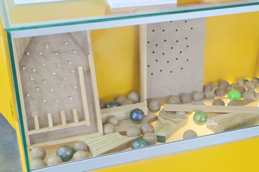 這是之前辦過的活動,讓孩子自己動手做彈珠檯,創造自己的彈珠關卡。這完全展現朱銘美術館在注重引導兒童的藝術教學,並深耕美育在生活的理念。