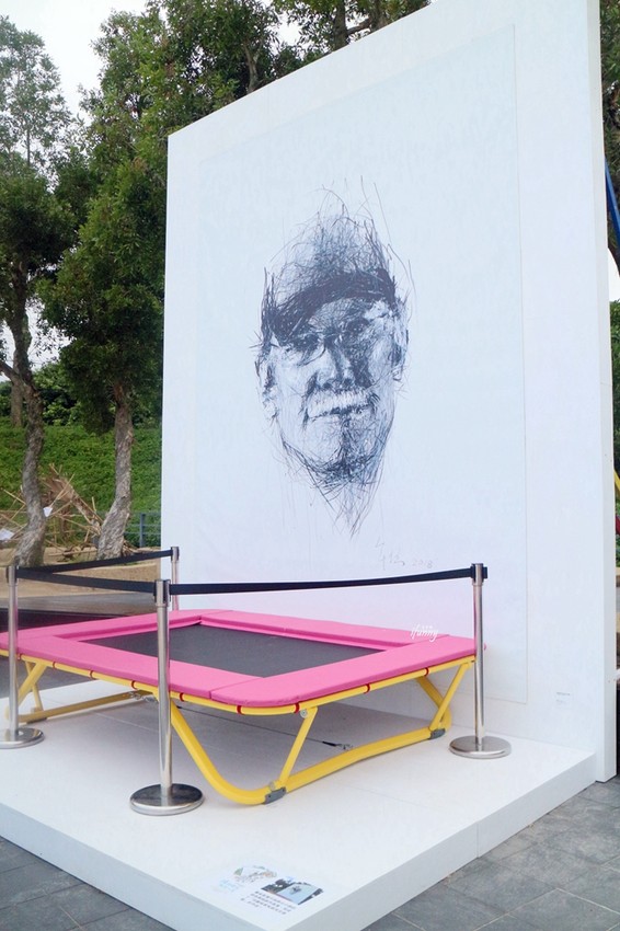 廣場旁有一幅朱銘老師的畫像,但為何前面放置了一個彈簧床呢?