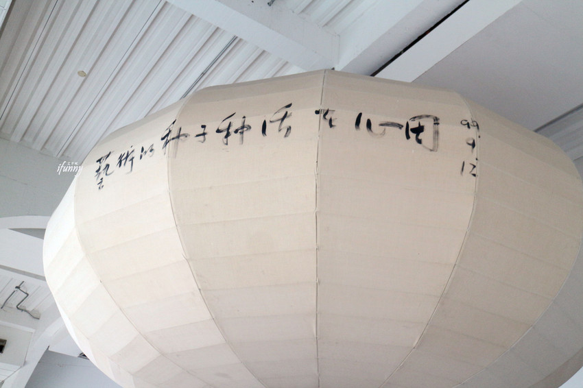 這燈籠上的字是朱銘老師在美術館開幕前一天親自提上去的,<藝術的種子種活在心田>,要讓大家都能用心來感受藝術帶來生活上的美好。藝術的種子種活在心田>