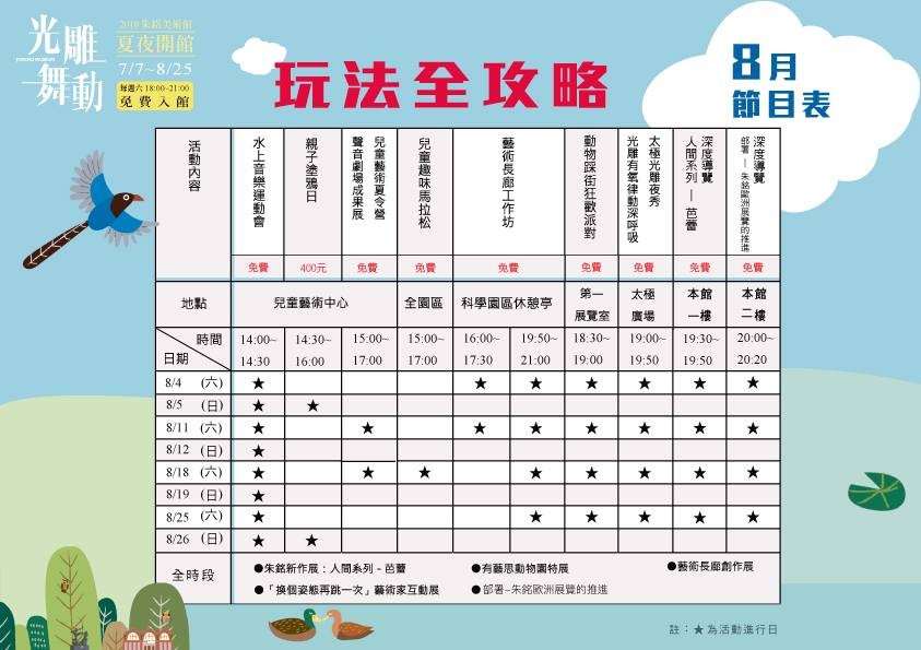 這是朱銘美術館一般開放的時間,但在7/7/~8/25每週六18:00~21:00 舉辦光雕舞動夜間活動,是免費入場的喔!稍候幫大家詳細介紹。