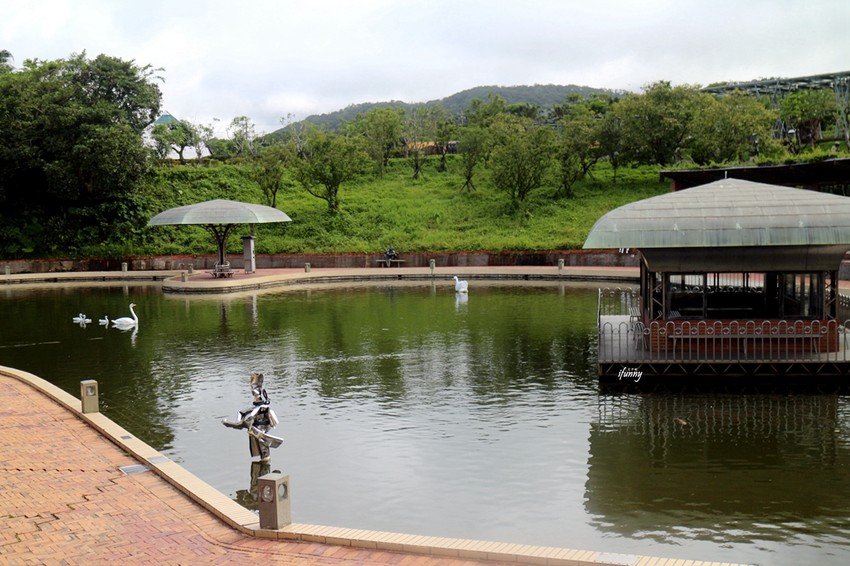 池子裡有幾可亂真的天鵝藝術品,也有真實的天鵝,就待大家來分辨真偽喔!