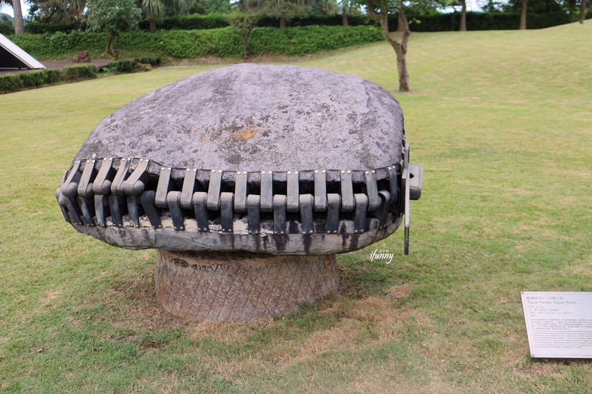 來到這拉鏈區,就知道來到了朱雋區。身為朱銘老師的長子,朱雋挑戰不同於父親的木頭創作,他選擇更硬的石頭來創作。石頭裂掉了,他就幫石頭上了拉鏈。
