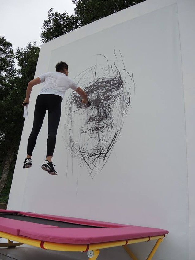 這是朱銘美術館的藝術家互動展,由藝術家蔡年玨利用每次彈跳一筆一畫完成的作品,這可是需要強大的體力啊!