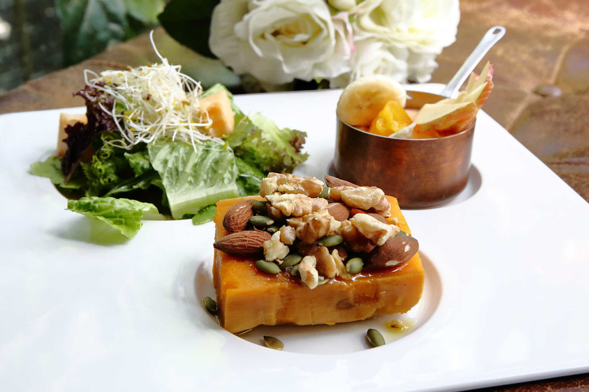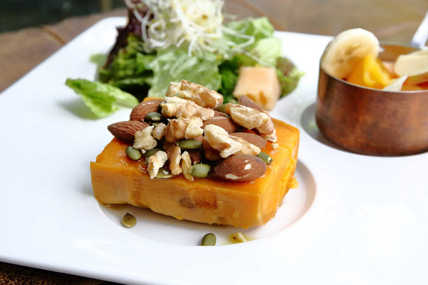 堅果地瓜+生菜沙拉+當季水果,早餐地瓜新吃法!