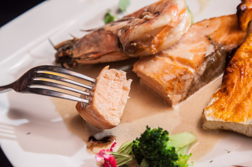 切下肉質細嫩的鮭魚排,雙面煎香的鮭魚排散發著迷人的焦香氣,伴著濃郁的醬汁一起入口,醬汁風味相當濃厚,茴香及白酒清香的氣息更襯托出鮭魚的油脂鮮,虎蝦也貼心地去好殼了,用刀叉就可以享受厚實Q嫩的蝦肉