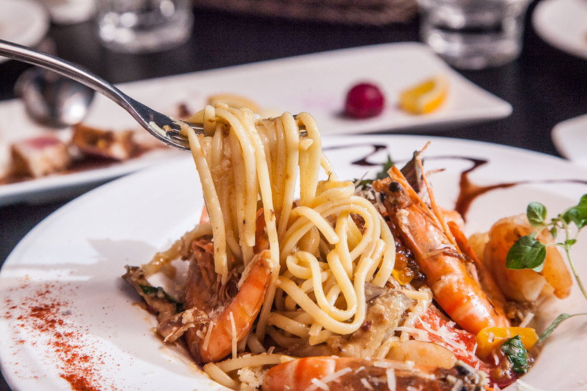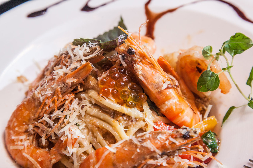 這也是一道著重海味彭湃的經典之作,基底風味以大蒜、明太子及XO醬呈現,佐以鮮蝦搭配細扁麵體拌炒