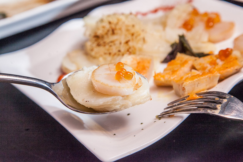 馬鈴薯裡面的醬料有點類似白醬的香味,濃郁甜香,馬鈴薯吃起來鬆軟綿密,可以再連同干貝、鮭魚卵一同入口,鬆軟綿香海味十足,頗讓人印象深刻,很有記憶點的一道菜