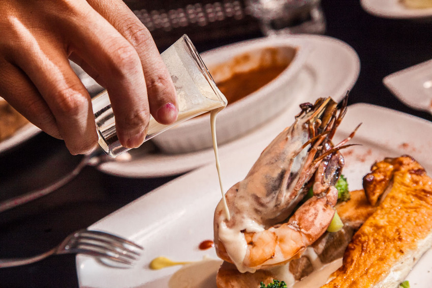 吃的時候先淋上茴香白酒醬汁,讓醬汁的風味附著在蝦身及魚肉上