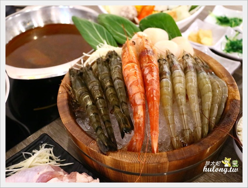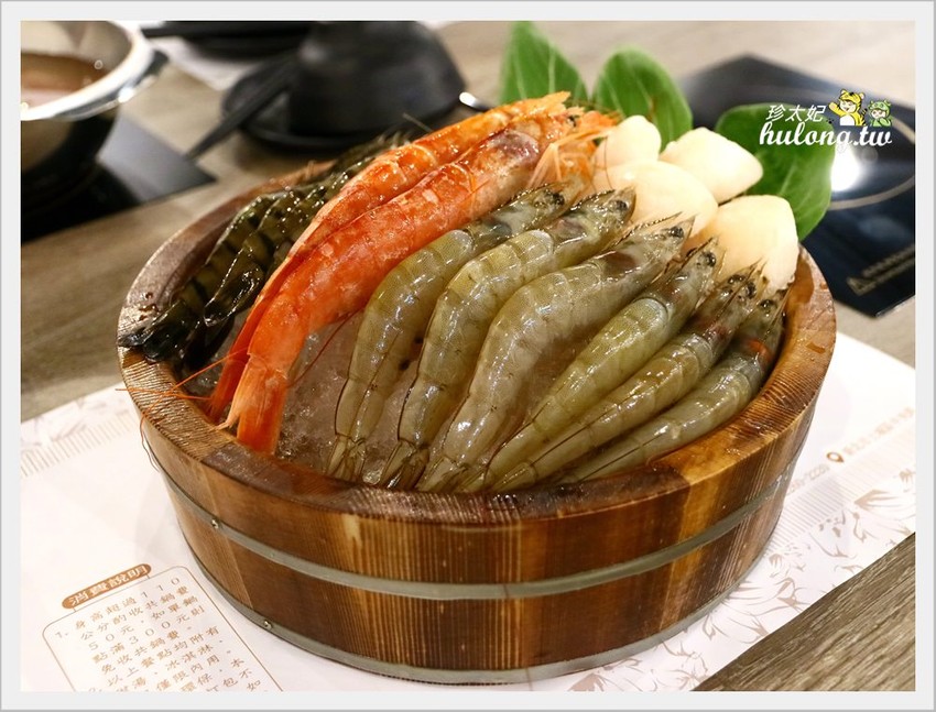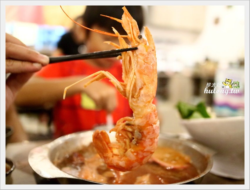 『狠蝦干貝鍋』含兩大隻比臉長的天使紅蝦、以及多隻白蝦和草蝦,干貝更是大器的附上四大顆,絕對要讓你不吃到痛瘋不准離開
