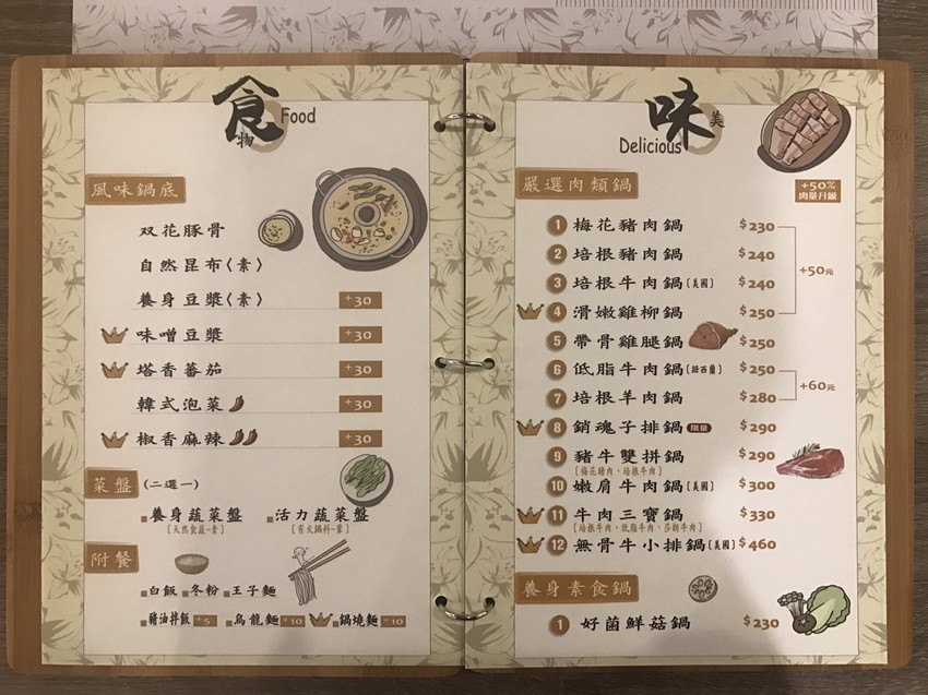 除了牛、羊、豬肉鍋,也有雞肉鍋和養生素食鍋可選擇,吃素的朋友也可以一起吃火鍋吃的暢快,