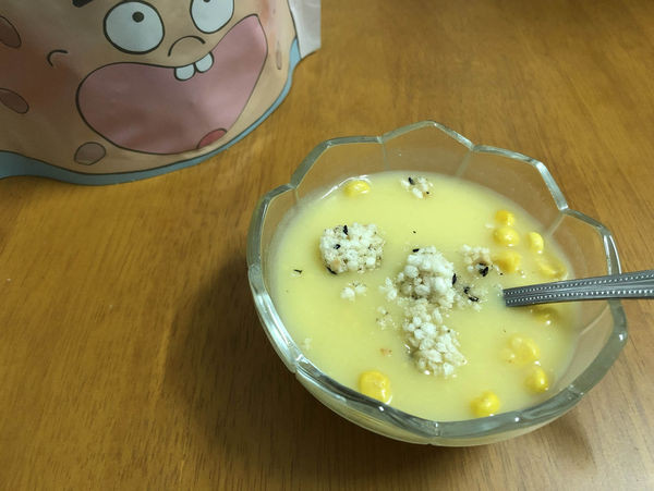 或是來杯香濃的玉米濃湯,加入米香攪拌泡一下,米香稍微變軟的口感,跟玉米濃湯相當速配,喝一杯就很有飽足感。